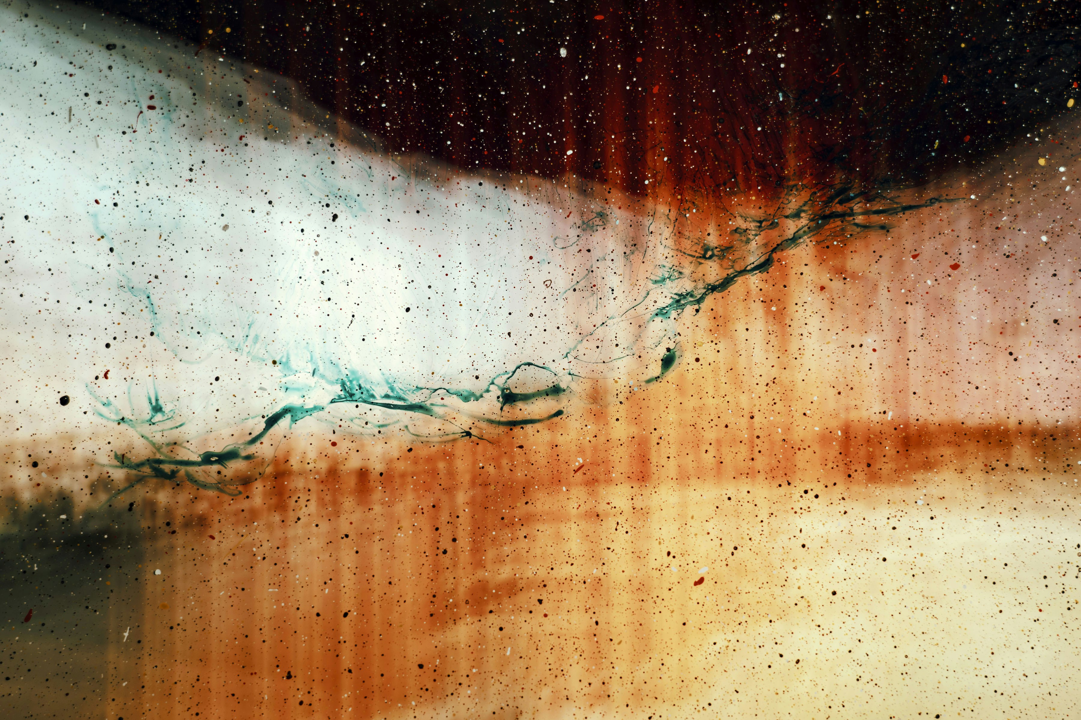 She thinks of you as she swirls the brushes and turns the white spirit murky. Everything you had been wearing that morning seemed out of place. That beautiful sage green dress, a lace strip patterned like frost around the bust. Proper evening wear, apart from the shoes. Bare feet, just a pair of tan tights ripped around the toes. She only saw the details after you lay broken on the concrete bleeding rivers into the gravel soak-away around the building’s base but now she imagines them there as you fell. She has perfected her image of you, crystallizing the moment in the smoke of her memory. Mid-air. Falling forever.